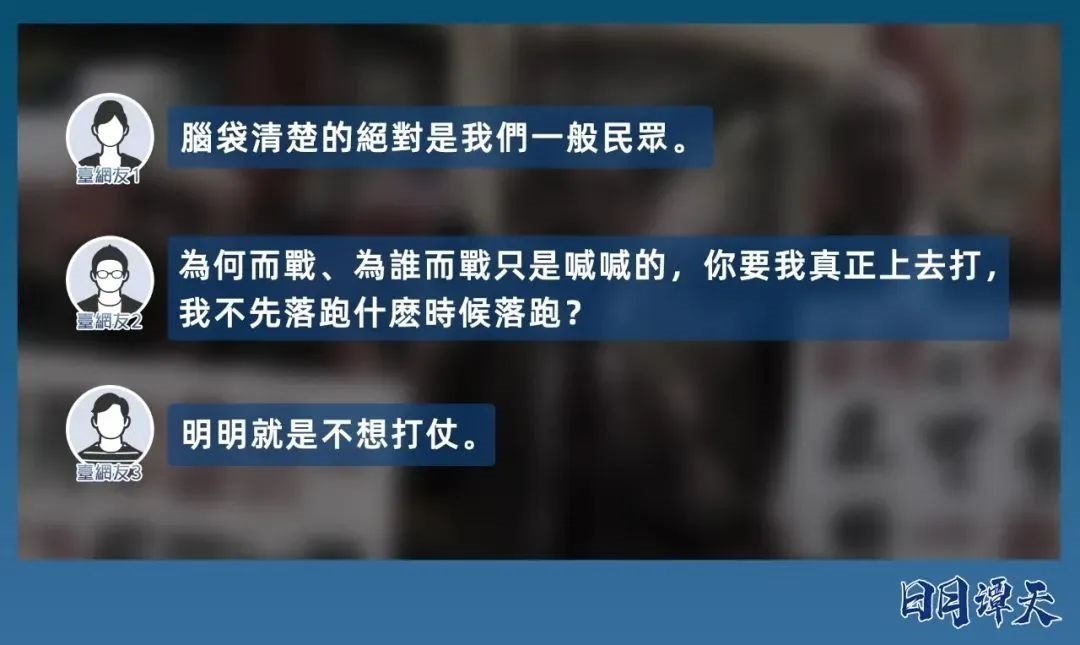 譚主一位來自新北的青年朋友小章說,他服四個月義務(wù)兵役時“每天都想要逃離”,服完役才感到解脫,那段時間的心情就是“來不及了快下車”“民進(jìn)黨就是‘臺獨(dú)’啊,我不想去給他們當(dāng)炮灰”。