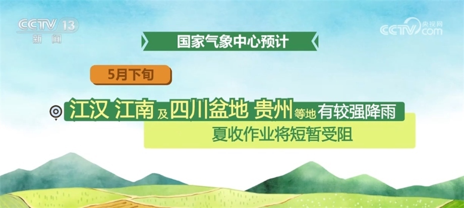 國(guó)家氣象中心預(yù)計(jì),5月下旬,北方冬麥區(qū)大部分時(shí)段以晴好天氣為主,墑情適宜,利于冬小麥灌漿成熟;江漢、江南及四川盆地、貴州等地有較強(qiáng)降雨,夏收作業(yè)將短暫受阻;江淮大部天氣較好,適宜夏收。