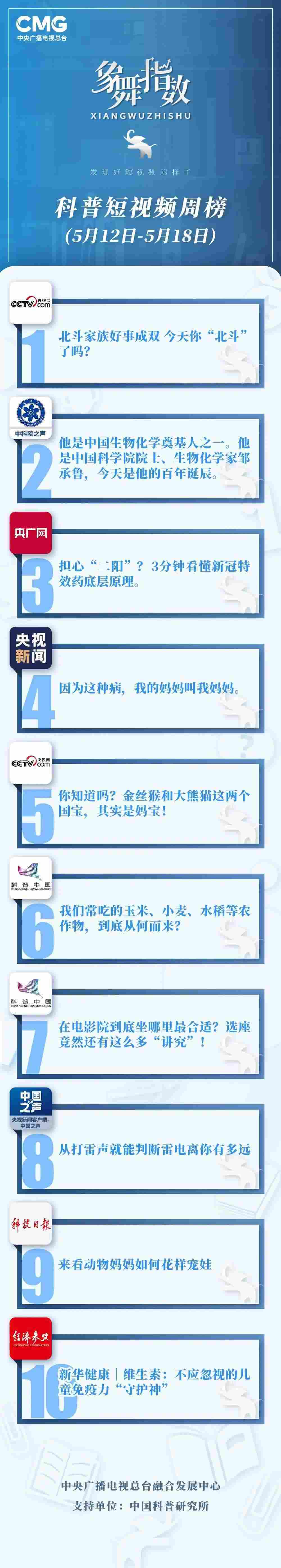 中央廣播電視總臺(tái)“象舞指數(shù)”評(píng)議品牌,推出科普短視頻周榜、總臺(tái)科普短視頻周榜。在2023年5月12日-5月18日,值得注目的內(nèi)容有: