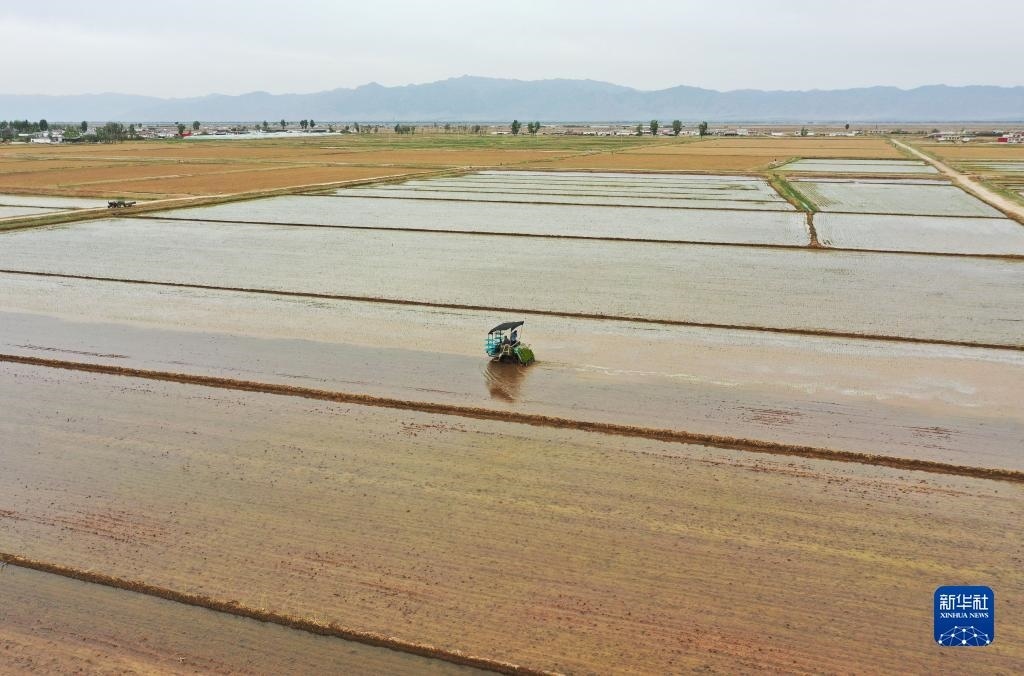 5月23日,達拉特旗昭君鎮(zhèn)村民在鹽堿地改良水稻田中使用農(nóng)機插秧(無人機照片)。