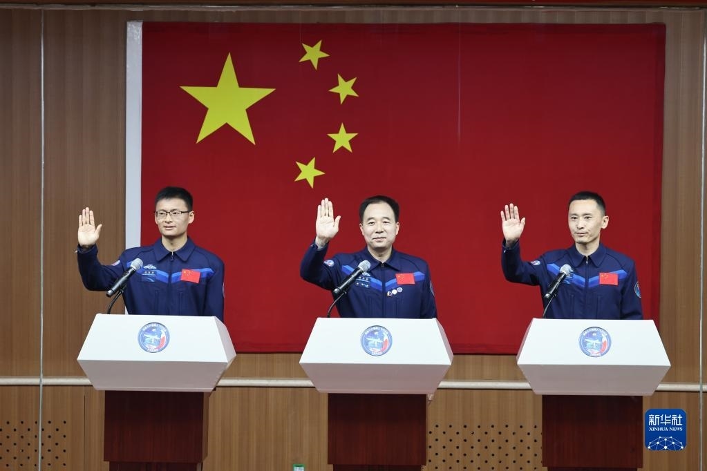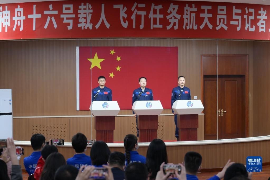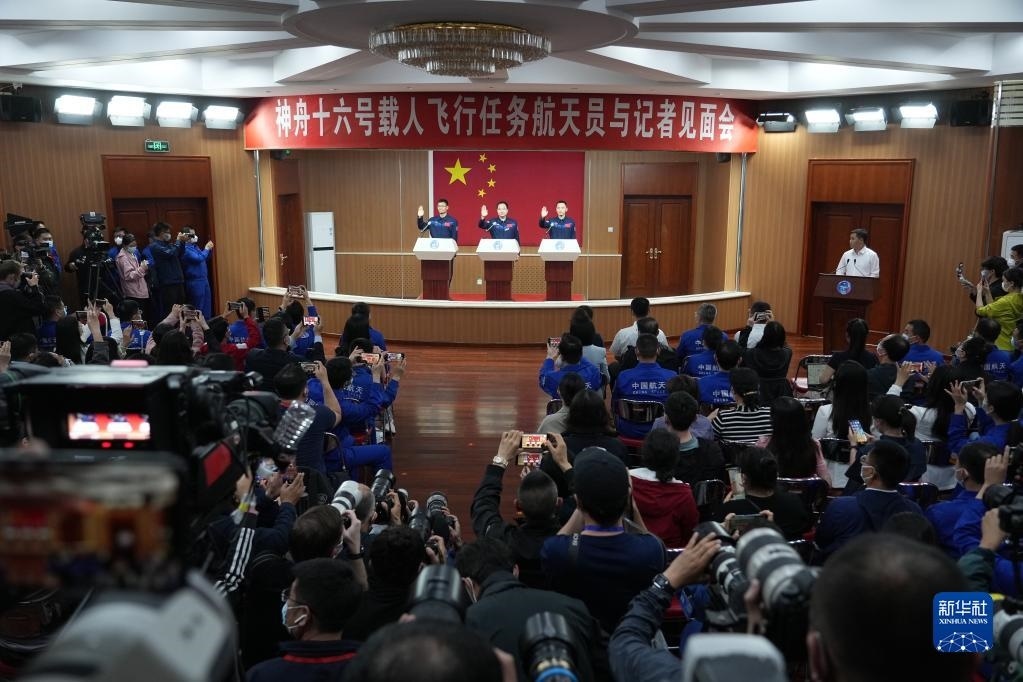 5月29日,神舟十六號航天員乘組與中外媒體記者集體見面會在酒泉衛(wèi)星發(fā)射中心問天閣舉行。這是指令長景海鵬(中)、航天飛行工程師朱楊柱(右)、載荷專家桂海潮揮手致意。