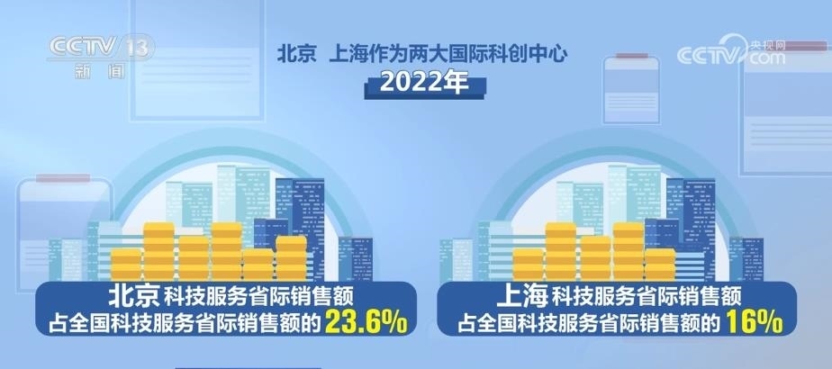 從創(chuàng)新來看,2017年—2022年,全國科技服務(wù)省際銷售額年均增長28%,較科技服務(wù)總體銷售收入增速快4.2個(gè)百分點(diǎn)。今年截至5月20日,科技服務(wù)省際銷售額同比增長29.7%,較科技服務(wù)總體銷售收入增速快2.6個(gè)百分點(diǎn)。北京、上海作為兩大國際科創(chuàng)中心,2022年科技服務(wù)省際銷售額分別占全國科技服務(wù)省際銷售額的23.6%和16%;2017年—2022年年均分別增長22.1%和24.2%。