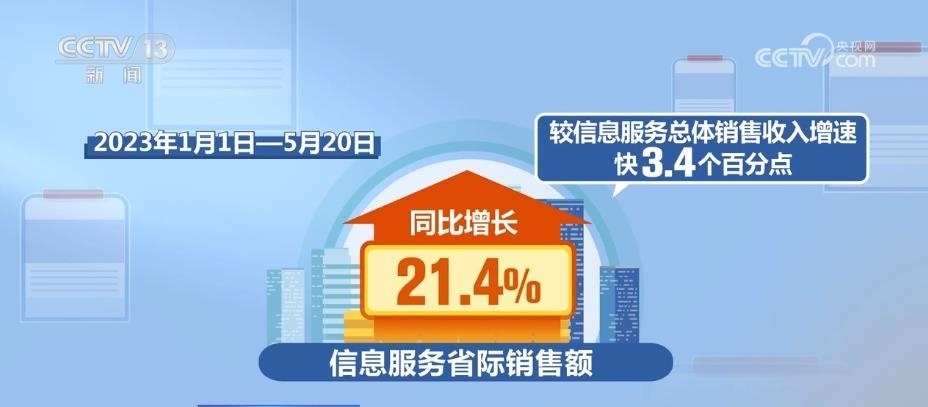 從信息方面來看,2017年—2022年,全國信息服務(wù)省際銷售額年均增長22%,較信息服務(wù)總體銷售收入增速快2.8個(gè)百分點(diǎn)。2023年1月1日—5月20日,信息服務(wù)省際銷售額同比增長21.4%,較信息服務(wù)總體銷售收入增速快3.4個(gè)百分點(diǎn)。