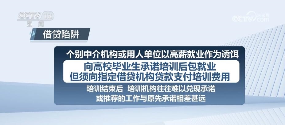個別中介機(jī)構(gòu)或用人單位以高薪就業(yè)作為誘餌,向高校畢業(yè)生承諾培訓(xùn)后包就業(yè),但須向指定借貸機(jī)構(gòu)貸款支付培訓(xùn)費(fèi)用。培訓(xùn)結(jié)束后,培訓(xùn)機(jī)構(gòu)往往難以兌現(xiàn)承諾,或推薦的工作與原先承諾相差甚遠(yuǎn)。