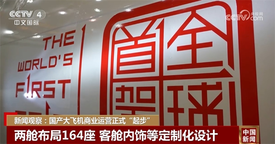 今天執(zhí)行商業(yè)首飛的C919飛機為164座兩艙布局,公務(wù)艙8座,經(jīng)濟(jì)艙156座。客艙內(nèi)飾、旅客座椅、機載娛樂系統(tǒng)和飛機外部涂裝做了定制化設(shè)計。機身前部印有“全球首架”的“中國印”標(biāo)識和對應(yīng)英文。飛機注冊號B-919A,“B”代表飛機的中國國籍,“919”和型號名稱契合,“A”則有首架之意,突顯這一全球新機型、全球首架的非凡意義。