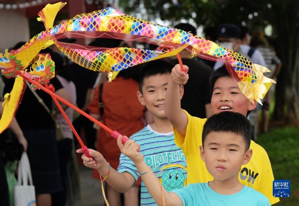 6月3日,廈門(mén)小學(xué)生在2023海峽兩岸(集美)龍舟文化節(jié)活動(dòng)現(xiàn)場(chǎng)體驗(yàn)舞龍。