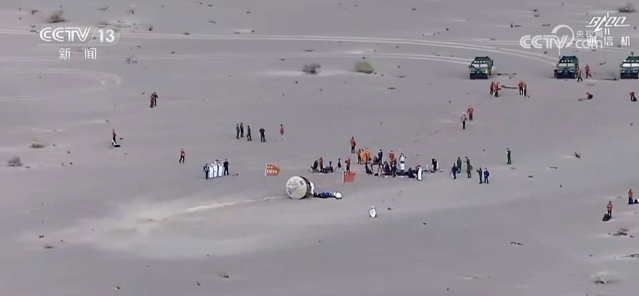 返回艙成功著陸,擔(dān)負(fù)搜救回收任務(wù)的搜救分隊及時發(fā)現(xiàn)目標(biāo)并抵達(dá)著陸現(xiàn)場。