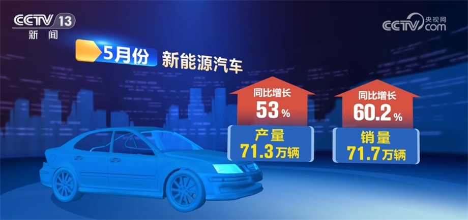 其中,新能源汽車產銷量分別完成71.3萬輛和71.7萬輛,同比分別增長53%和60.2%,市場占有率達到30.1%。在出口方面,5月份,全國汽車出口38.9萬輛,同比增長58.7%。