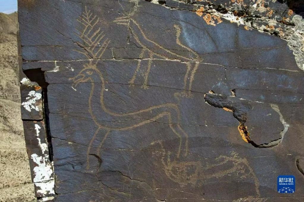 甘肅省酒泉市肅北蒙古族自治縣旱峽巖畫中的一幅鹿形、狼形巖畫(資料照片)。