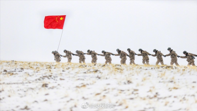 近日,新疆軍區(qū)某合成團官兵在海拔5200米的高原,開展邊境巡邏任務(wù)。皚皚白雪之上,邊防官兵手拉著手前行,臉頰凍得通紅,笑容卻堅定又自豪。