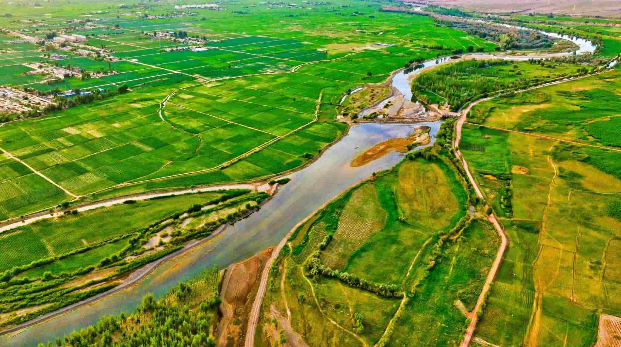 2023年6月15日,甘肅省張掖市,甘州區(qū)靖安鄉(xiāng)、臨澤縣板橋鎮(zhèn)境內(nèi)的黑河兩岸,寬闊的河床、彎曲的河流、農(nóng)作物以及樹木、蘆葦、濕地在夕陽的映照下綠意盎然。視覺中國