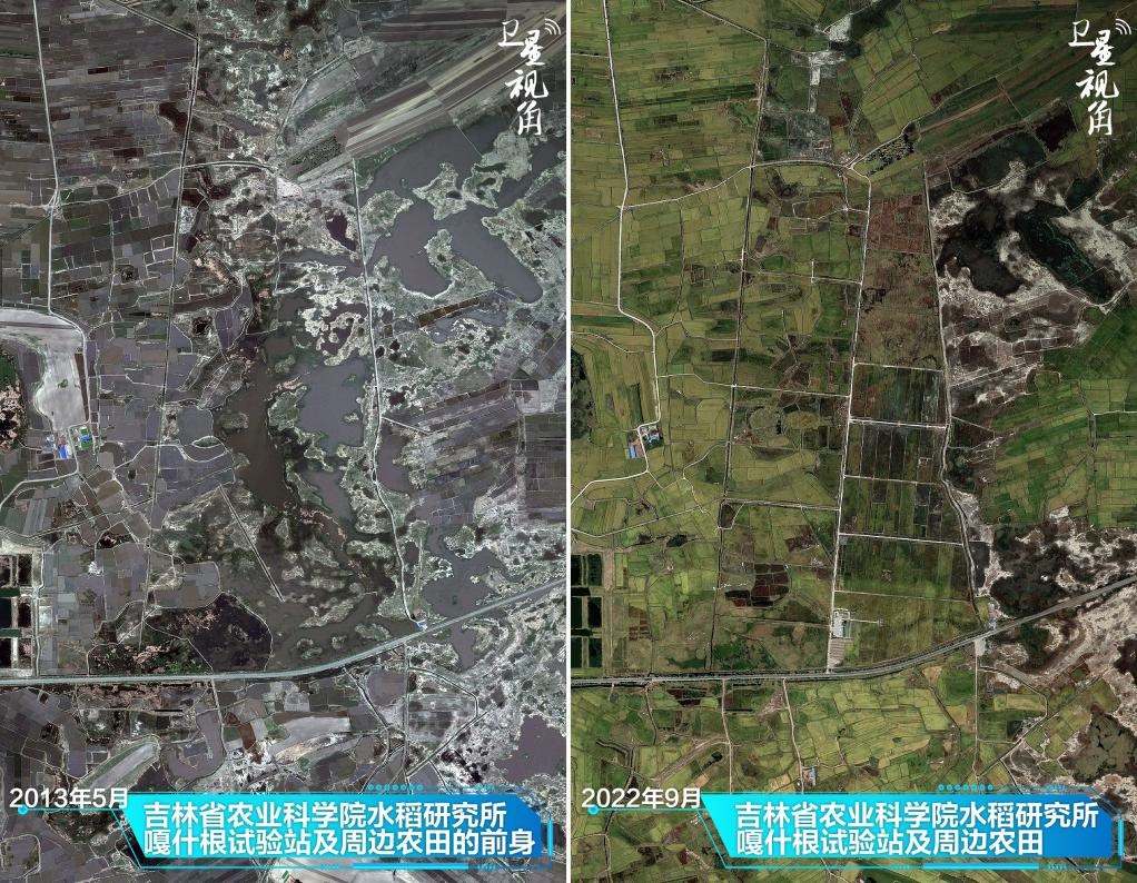 ↑2022年與2013年相比,經(jīng)過(guò)治理,吉林省白城市鎮(zhèn)賚縣嘎什根鄉(xiāng)大片鹽堿地變良田。