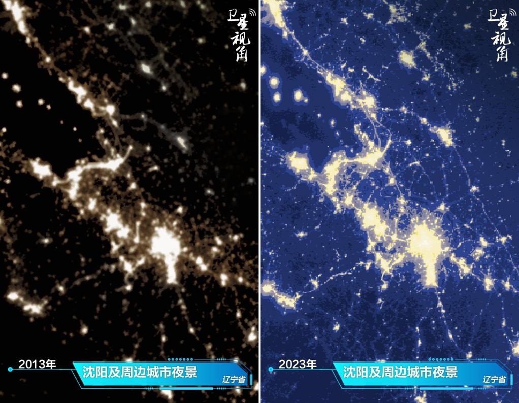 ↑2023年與2013年相比,沈陽(yáng)及周邊城市夜光更亮了。