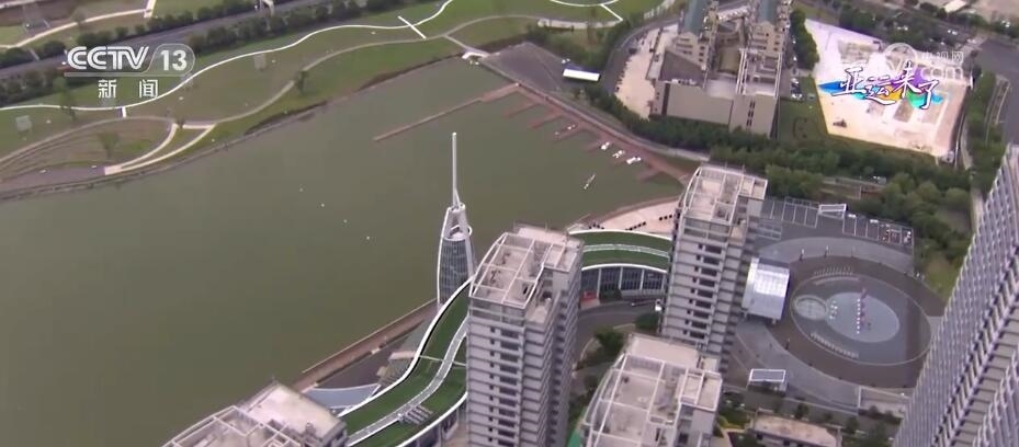 總臺記者 梁燁:但是要說溫州什么運動最熱鬧,那就肯定是龍舟了。我們現(xiàn)在看到的是溫州龍舟運動中心,這里是全亞洲最高標準的龍舟賽場。我們從空中俯瞰,整棟樓看起來非常狹長,并且高低起伏猶如山脈,就好像是一條龍靜臥在水面之上,因此,這幢樓也被稱為“龍樓”。比賽時,這里主要作賽事保障用途。緊挨著龍樓的這座,從正面看像是船槳,從側(cè)面看像龍舟的建筑就是舟塔,這也是比賽的終點塔。比賽期間,裁判員們就會在這里觀看比賽,在這里計時計分。此時此刻,我們看到水面上正在進行演練,他們所劃行的這1200米的賽道到時候就是龍舟的比賽場地。