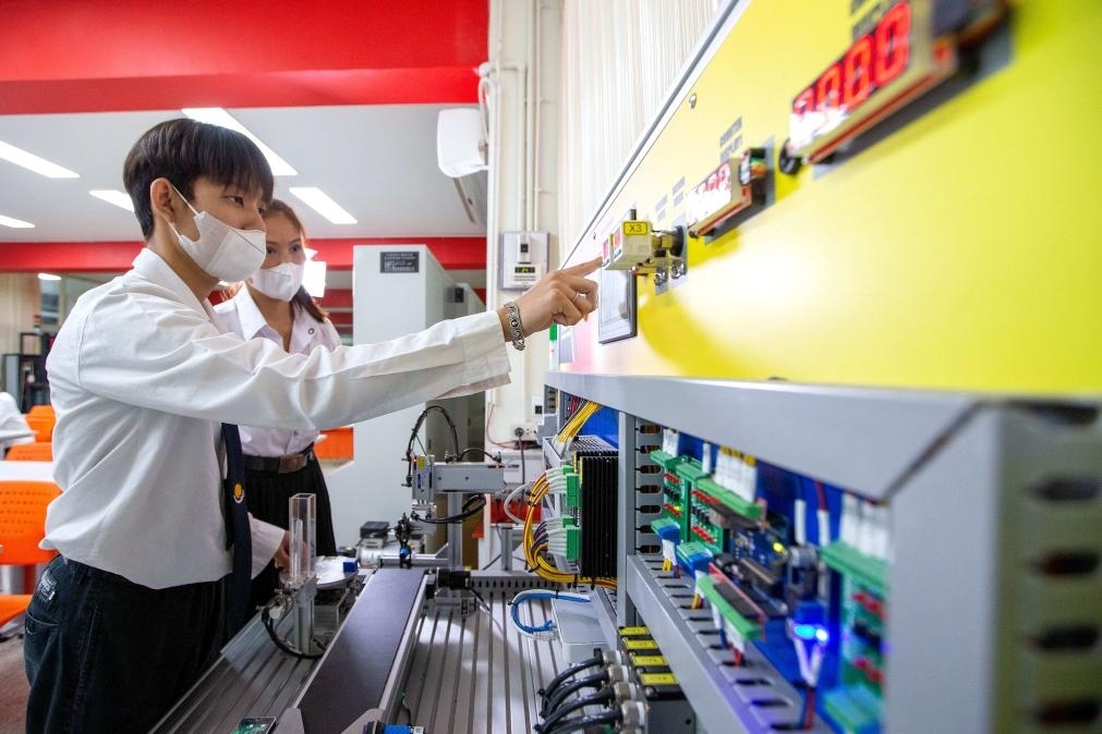 3月14日,在泰國(guó)大城府大城技術(shù)學(xué)院魯班工坊,學(xué)生在課堂上操作自動(dòng)化生產(chǎn)線安裝調(diào)試系統(tǒng)。新華社記者 王騰 攝
