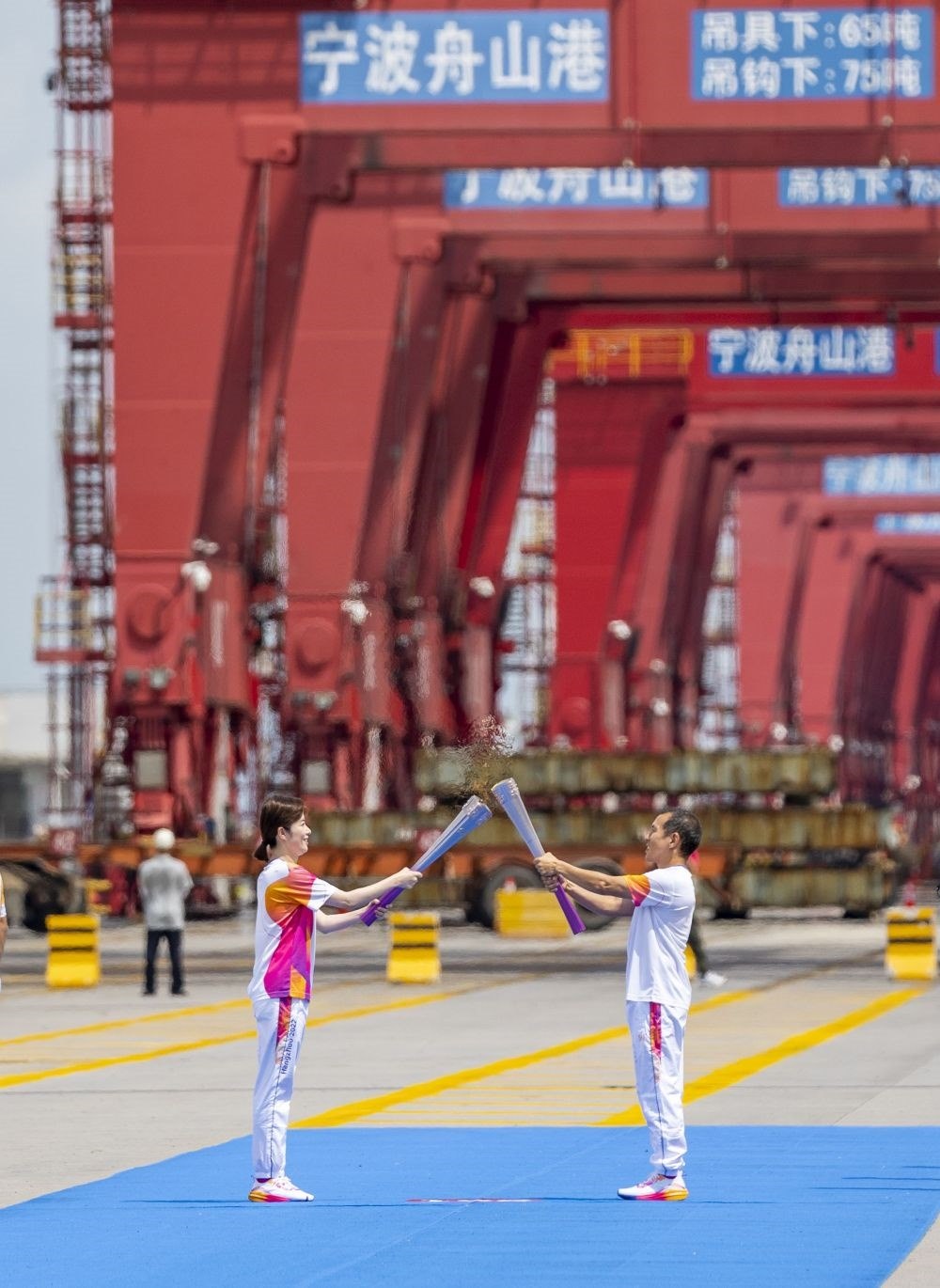 ↑這是杭州亞運(yùn)會(huì)火炬?zhèn)鬟f寧波站收火儀式現(xiàn)場(chǎng)。