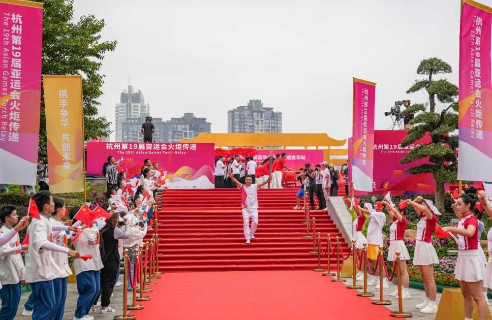 ↑這是杭州亞運(yùn)會(huì)火炬?zhèn)鬟f杭州站起跑儀式現(xiàn)場(chǎng)。
