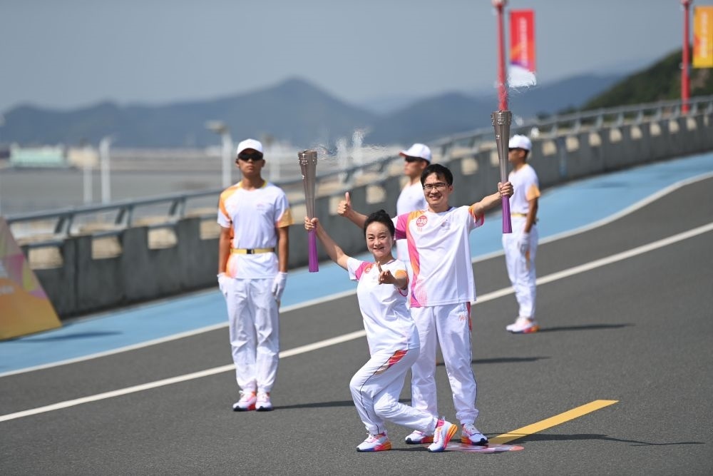 ↑火炬手鄭方(右)和施金仙在火炬?zhèn)鬟f中。