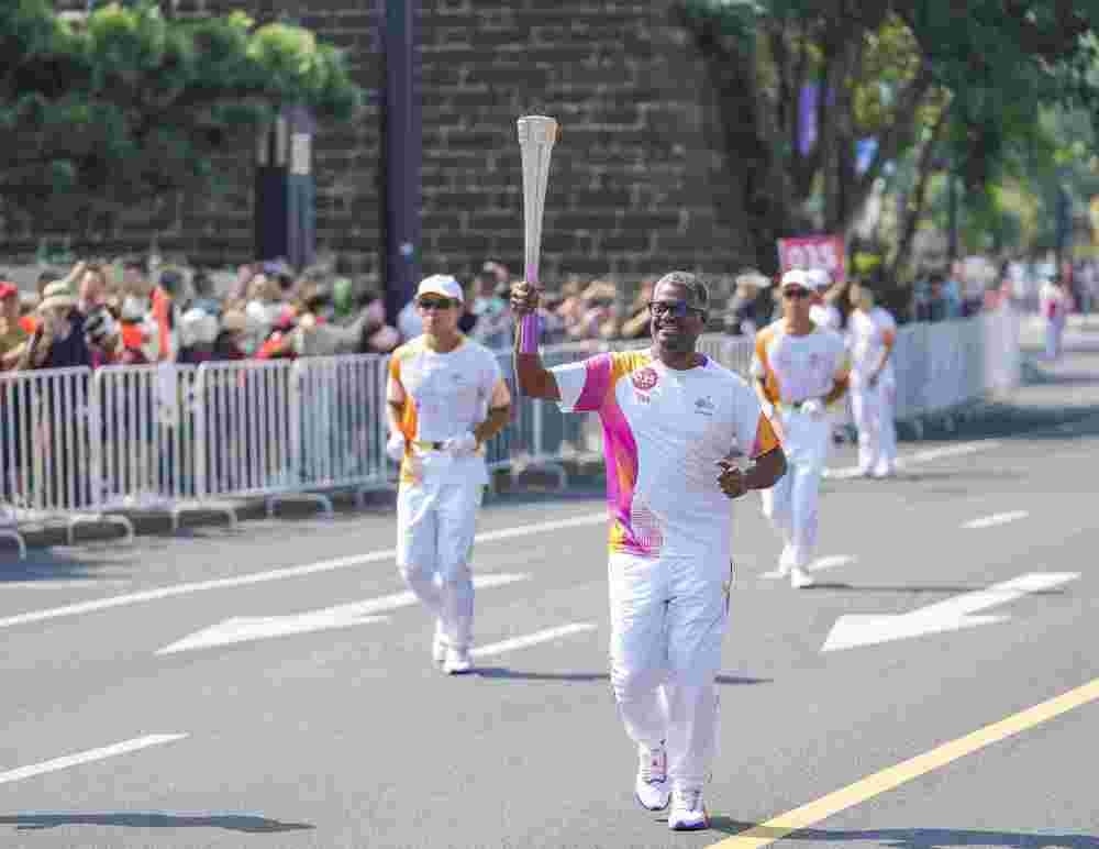 ↑火炬手王懿律在火炬?zhèn)鬟f中。