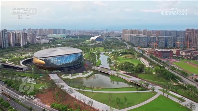 杭州亞運會運河體育公園指揮長馮晶:“亞運體育公園是按照綠色環(huán)保功能打造的,也是浙江省首座體育場館綠色三星級建筑。體育館的外立面采用陽極氧化鋁材料,在雨天有自清潔的功能,不用人工清洗外立面。透水混凝土在雨天有非常好的滲水功能,和我們的人工湖相結合,在晴天可以反哺草地,實現(xiàn)海綿城市的標準規(guī)范?!?/p>