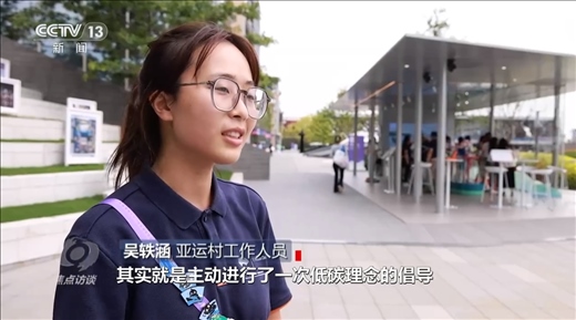 亞運村工作人員吳軼涵:“徽章交換中心建筑本身就是以低碳的材料制作而成的,同時也制作了以低碳材料而制作的徽章,這些徽章給運動員交換使用。所以每次在這里完成一次徽章交換其實就是主動進行了一次低碳理念的倡導。”