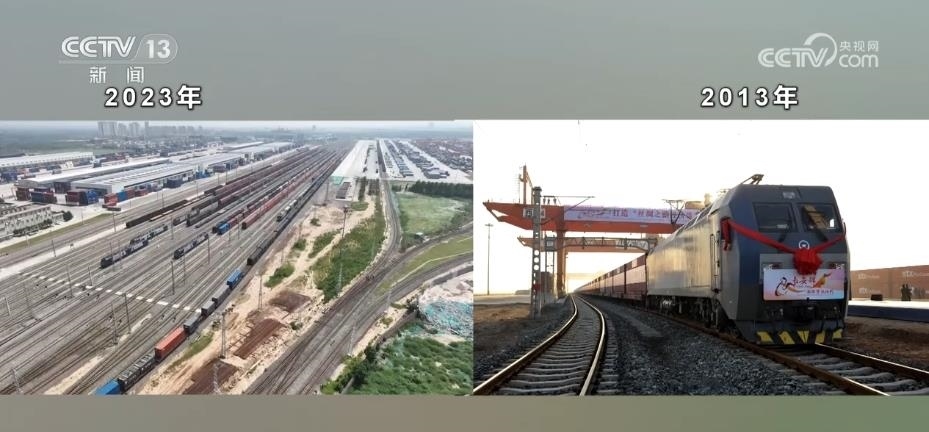 幾百輛剛出廠的新能源汽車整齊地排列在站臺上陸續(xù)裝箱,馬上它們將乘坐中歐班列“長安號”前往中亞。2023年是“一帶一路”倡議提出10周年,也是中歐班列“長安號”開行10周年。每天都有數(shù)以億計(jì)的貨物在這里集散。