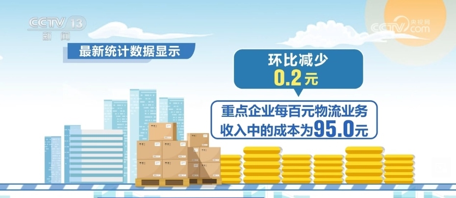 據(jù)介紹,近期,上游原材料價格趨緩,物流企業(yè)經(jīng)營成本壓力略有緩解。最新統(tǒng)計數(shù)據(jù)顯示,重點企業(yè)每百元物流業(yè)務(wù)收入中的成本為95.0元,環(huán)比減少0.2元。