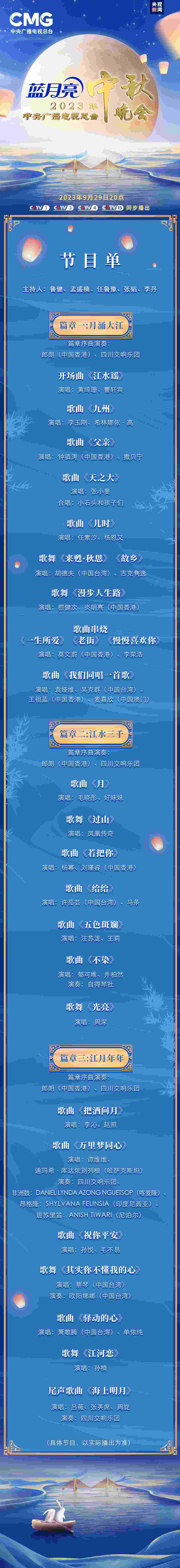 一年逢好夜,萬里見明時。9月29日晚8時,《中央廣播電視總臺2023年中秋晚會》將與全球受眾見面,晚會節(jié)目單正式發(fā)布。
