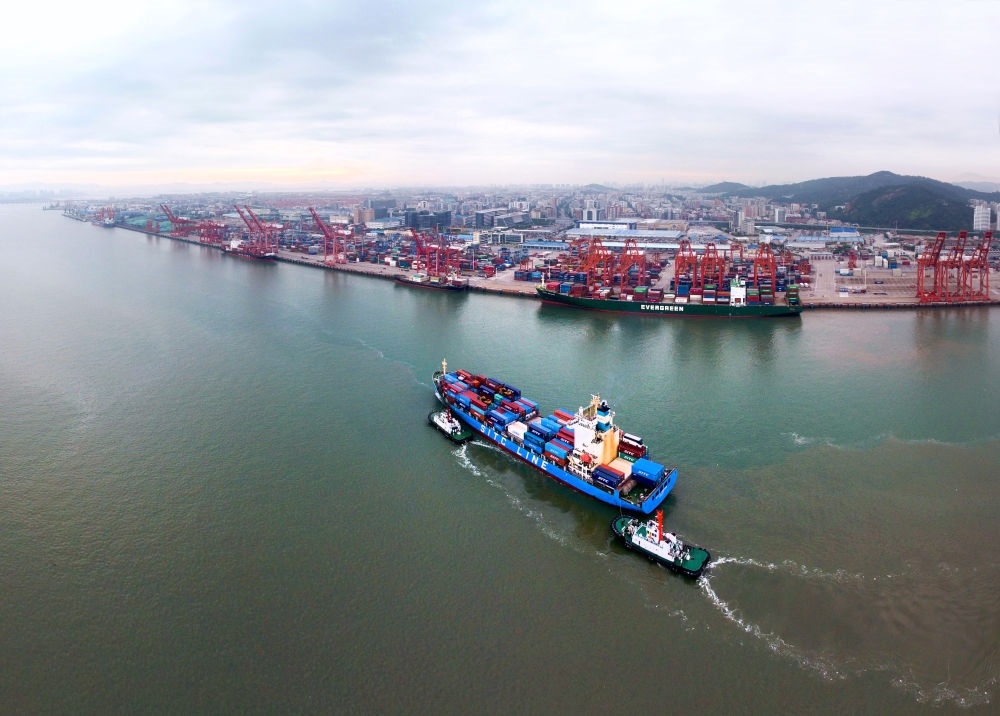 在福建自貿(mào)區(qū)廈門片區(qū)東渡港區(qū),一艘貨輪向碼頭靠攏(2017年8月26日無人機照片)。新華社記者 姜克紅 攝