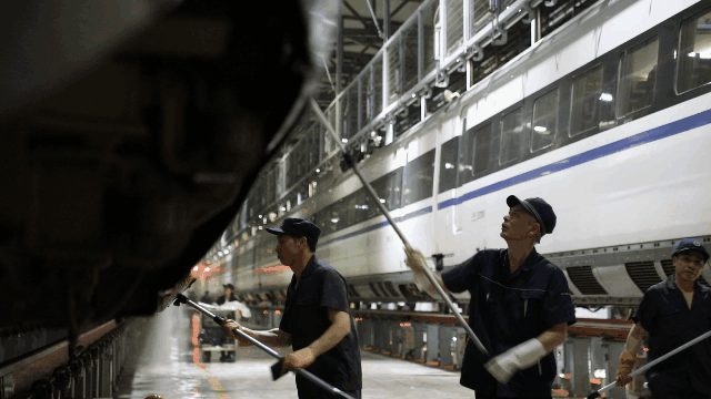 經過自動清洗的動車組在開進動車所檢修庫后,將由洗車人員進行深度清潔。20多名洗車人員分工協作對動車組車頂、車身等各部位進行清洗。