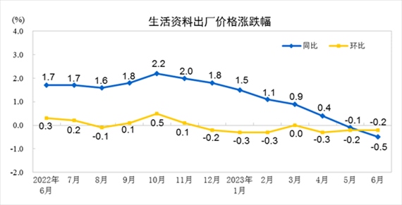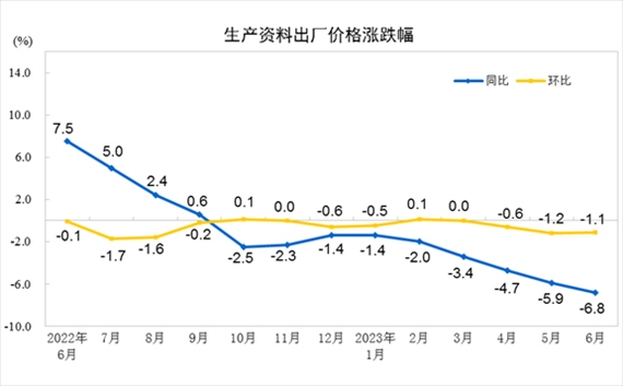 央視網(wǎng)消息:據(jù)國(guó)家統(tǒng)計(jì)局網(wǎng)站消息,2023年6月份,全國(guó)工業(yè)生產(chǎn)者出廠(chǎng)價(jià)格同比下降5.4%,環(huán)比下降0.8%;工業(yè)生產(chǎn)者購(gòu)進(jìn)價(jià)格同比下降6.5%,環(huán)比下降1.1%。上半年,工業(yè)生產(chǎn)者出廠(chǎng)價(jià)格比上年同期下降3.1%,工業(yè)生產(chǎn)者購(gòu)進(jìn)價(jià)格下降3.0%。