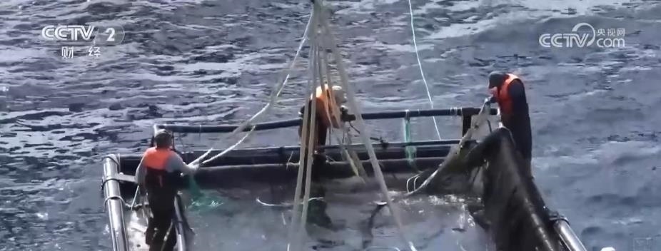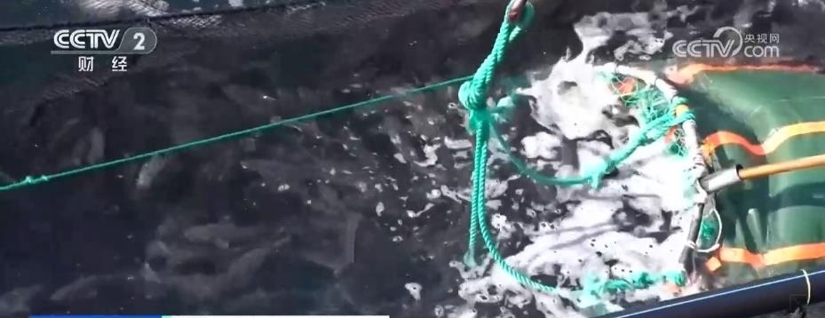 在煙臺(tái)長(zhǎng)島南隍城海域,隨著經(jīng)海系列深水網(wǎng)箱里魚類的成熟,一場(chǎng)在大海上的收獲正在進(jìn)行。起降機(jī)將一個(gè)個(gè)裝滿魚兒的巨大網(wǎng)兜轉(zhuǎn)移到運(yùn)輸船上,2.5萬尾近4萬斤的成品黑鲪魚,將從這里銷往全國(guó)各地。