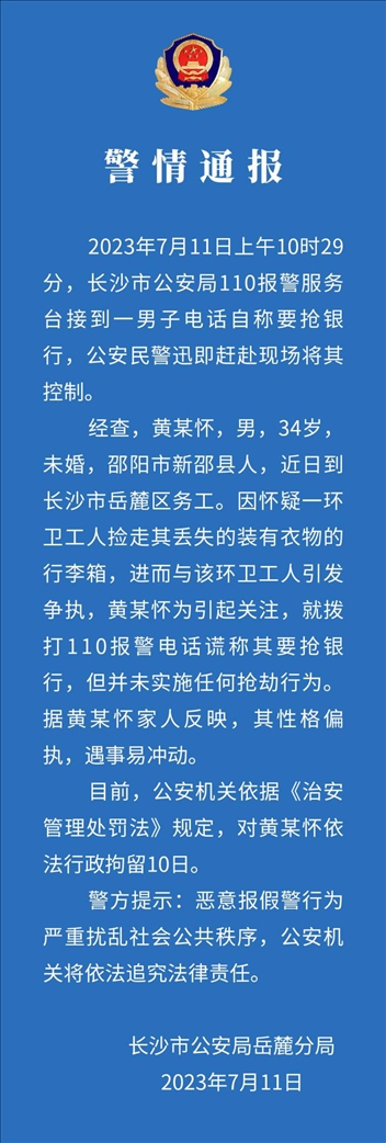 ·一人因與環(huán)衛(wèi)工人引發(fā)爭(zhēng)執(zhí),為引起關(guān)注,撥打110報(bào)警電話謊稱要搶銀行。長(zhǎng)沙警方通報(bào),對(duì)其依法行政拘留10日。