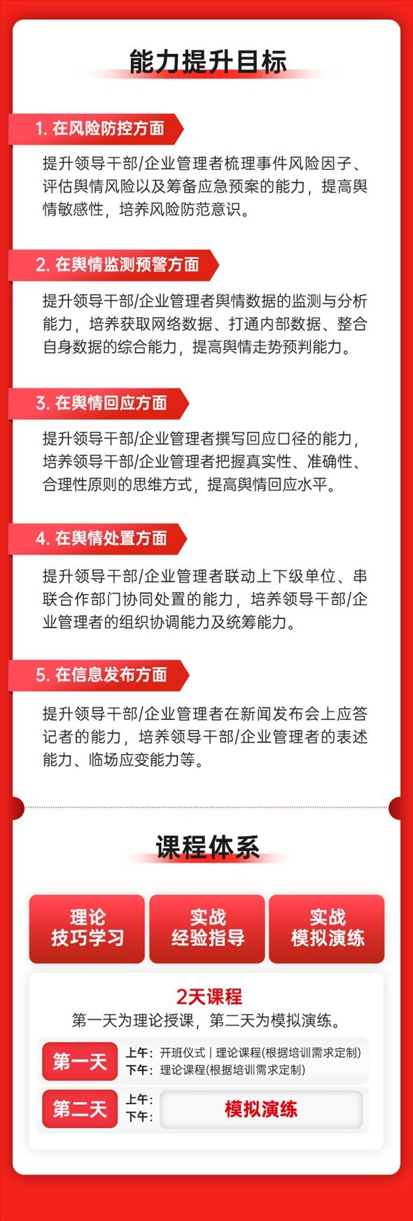 “突發(fā)事件輿情處置應(yīng)急演練體系”可針對不同需求,模擬某一輿情事件或某個具體場景,通過多角色、多維度的模擬設(shè)計,打造多人協(xié)同的實(shí)景演練。該體系通過以“演”帶“練”的方式,把書面應(yīng)急預(yù)案進(jìn)行實(shí)際模擬預(yù)演,檢驗(yàn)應(yīng)急預(yù)案的合理性與實(shí)效性;通過逼真的模擬設(shè)計,真實(shí)還原輿論沖突處置過程,提高演練針對性和實(shí)戰(zhàn)性;通過復(fù)盤與總結(jié),對演練效果進(jìn)行科學(xué)評估和點(diǎn)評,持續(xù)提升參訓(xùn)人員突發(fā)事件輿情處置經(jīng)驗(yàn)、處置能力,優(yōu)化輿情處置預(yù)案、處置環(huán)節(jié)。