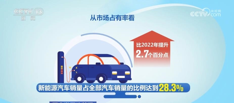 從市場(chǎng)占有率看,新能源汽車(chē)銷(xiāo)量占全部汽車(chē)銷(xiāo)量的比例達(dá)到28.3%,比2022年提升2.7個(gè)百分點(diǎn)。