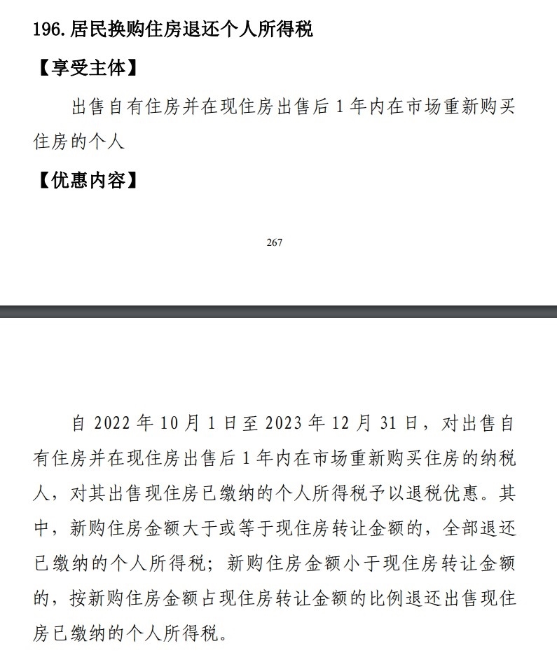 居民換購住房退還個(gè)人所得稅政策也已于2022年發(fā)布。按照規(guī)定,自2022年10月1日至2023年12月31日,對(duì)出售自有住房并在現(xiàn)住房出售后1年內(nèi)在市場(chǎng)重新購買住房的納稅人,對(duì)其出售現(xiàn)住房已繳納的個(gè)人所得稅予以退稅優(yōu)惠。其中,新購住房金額大于或等于現(xiàn)住房轉(zhuǎn)讓金額的,全部退還已繳納的個(gè)人所得稅;新購住房金額小于現(xiàn)住房轉(zhuǎn)讓金額的,按新購住房金額占現(xiàn)住房轉(zhuǎn)讓金額的比例退還出售現(xiàn)住房已繳納的個(gè)人所得稅。