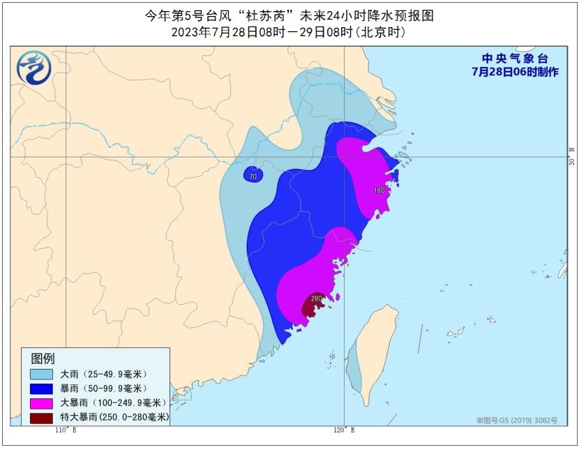 大風(fēng)預(yù)報:28日08時至29日08時,巴士海峽、南海東部和南部、臺灣以東洋面、臺灣海峽、東海大部,以及臺灣島及其沿海、福建及其沿海、浙江及其沿海、江西東部、江蘇沿海、上海及其沿海、廣東東部沿海將有5-7級風(fēng)、陣風(fēng)8-9級,其中南海東北部偏東海域、臺灣海峽、福建南部的部分地區(qū)及沿海、臺灣島西部沿海風(fēng)力可達(dá)8-12級、陣風(fēng)13-15級,“杜蘇芮”中心經(jīng)過的附近海域風(fēng)力可達(dá)13-16級,陣風(fēng)17級及以上。