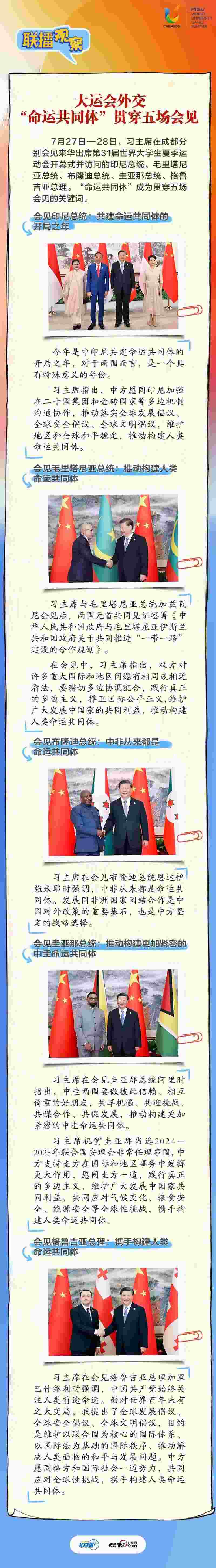 大運會時間,我國重要的主場外交也同步拉開帷幕,習(xí)近平主席的日程格外繁忙。央視網(wǎng)《聯(lián)播+》帶您沉浸式感受這場青春盛會為世界送出的別具匠心的“四川禮物”。
