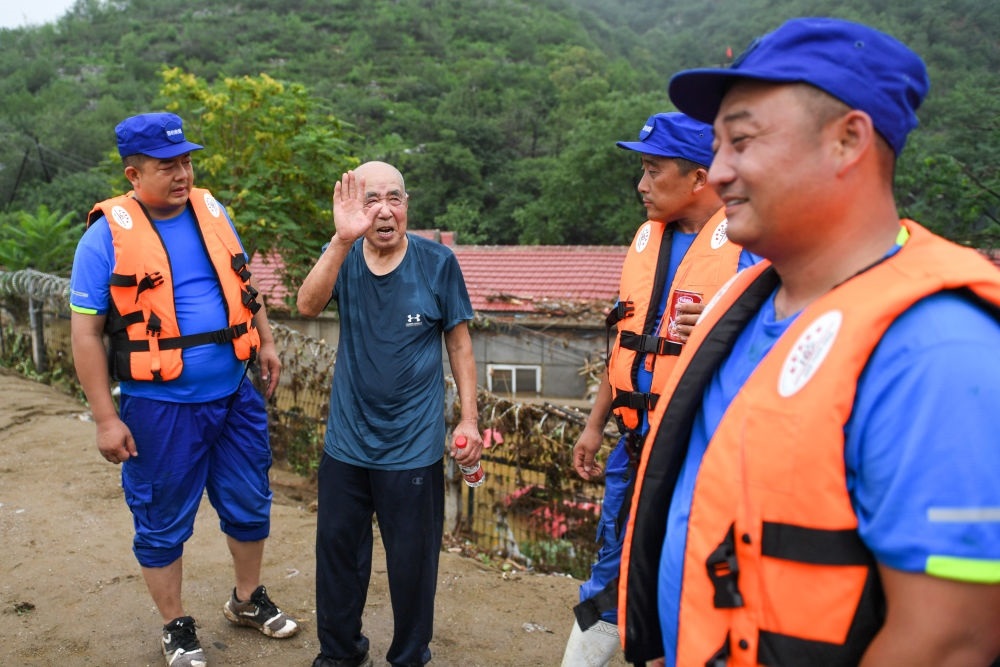 8月1日,在北京市門頭溝區(qū)水峪嘴村,一名87歲的村民向助他脫困的河北秦皇島獵豹救援隊隊員表示感謝。新華社記者 鞠煥宗 攝