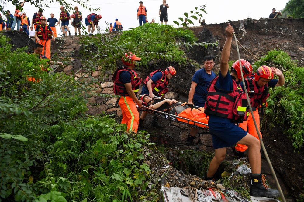 8月1日,在北京市門頭溝區(qū)水峪嘴村,在此增援的大興區(qū)消防救援支隊消防員在轉(zhuǎn)運被困受傷的村民。新華社記者 鞠煥宗 攝