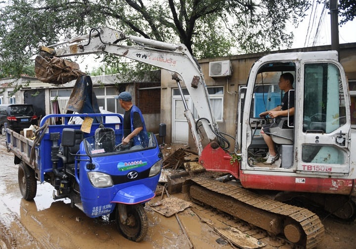 7月31日,在河北省石家莊市井陘縣307國道長崗村段,防汛工作人員駕駛機械清理淤泥。新華社發(fā)(梁子棟攝)