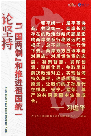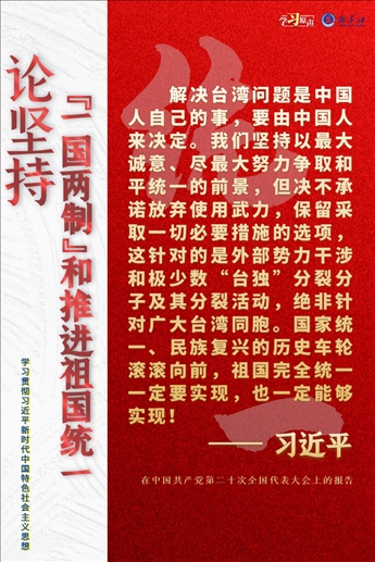 解決臺灣問題、實(shí)現(xiàn)祖國完全統(tǒng)一,是中國共產(chǎn)黨矢志不渝的歷史任務(wù),是全體中華兒女的共同愿望,是實(shí)現(xiàn)中華民族偉大復(fù)興的必然要求。必須堅(jiān)持貫徹新時代黨解決臺灣問題的總體方略,牢牢把握兩岸關(guān)系主導(dǎo)權(quán)和主動權(quán),堅(jiān)定不移推進(jìn)祖國統(tǒng)一大業(yè)。