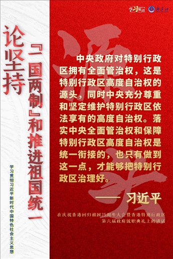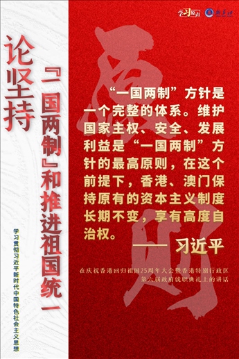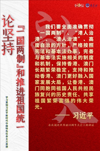 “一國兩制”是黨領(lǐng)導(dǎo)人民實(shí)現(xiàn)祖國和平統(tǒng)一的一項(xiàng)重要制度,是國家的一項(xiàng)基本國策。中國特色社會主義進(jìn)入了新時代,意味著“一國兩制”事業(yè)也進(jìn)入了新時代。不斷推進(jìn)“一國兩制”在香港、澳門的成功實(shí)踐,是中華民族偉大復(fù)興歷史進(jìn)程的重要組成部分。