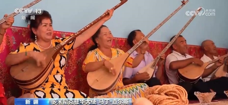 駐華使節(jié)們走進喀什古城的街市巷陌,感受當(dāng)?shù)鬲毺氐拿褡逦幕辉诳俗螤柷Х鸲?,領(lǐng)略跨越千年的石窟藝術(shù);來到新疆民間手工樂器制作第一村庫車市新和縣加依村,同當(dāng)?shù)匕傩找黄疠d歌載舞;觀看非遺項目十二木卡姆等一系列活動,讓使節(jié)們感嘆,新疆少數(shù)民族傳統(tǒng)文化和生活習(xí)俗得到了充分保護。