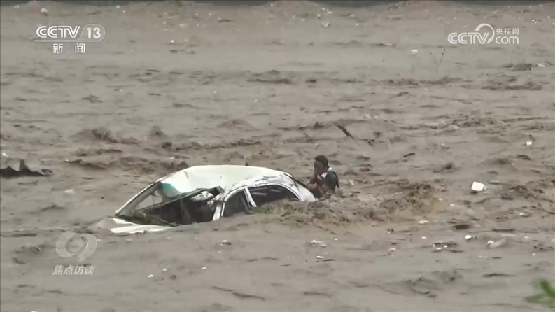 洪流一度沒過車頂,被困人員憑借著頑強的求生意識將頭伸出車外。現(xiàn)場指揮員立即更改作戰(zhàn)方案,協(xié)調起吊車等工程車輛協(xié)助救援。