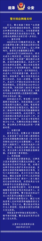·太原警方再通報(bào)“女生拒買水果撈被罵小三”:店方粗俗語言傷及未成年被拘留5日,家長以及另外兩名店方人員互相辱罵等被罰款。
