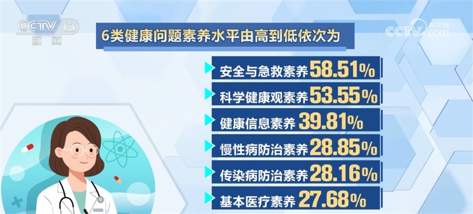 6類健康問題素養(yǎng)水平由高到低依次為:安全與急救素養(yǎng)58.51%、科學(xué)健康觀素養(yǎng)53.55%、健康信息素養(yǎng)39.81%、慢性病防治素養(yǎng)28.85%、傳染病防治素養(yǎng)28.16%和基本醫(yī)療素養(yǎng)27.68%。各類健康問題素養(yǎng)均有不同程度提升,其中,健康信息素養(yǎng)水平增幅最大,較2021年提升了3.88個(gè)百分點(diǎn)。本次監(jiān)測(cè)覆蓋31個(gè)?。ㄗ灾螀^(qū)、直轄市)的336個(gè)縣(區(qū))1008個(gè)鄉(xiāng)鎮(zhèn)(街道),對(duì)象為15—69歲常住人口。