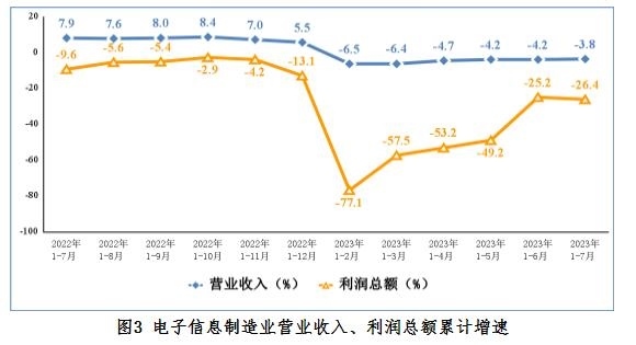 1—7月份,規(guī)模以上電子信息制造業(yè)實(shí)現(xiàn)營(yíng)業(yè)收入7.98萬億元,同比下降3.8%,較上半年降幅收窄0.4個(gè)百分點(diǎn);營(yíng)業(yè)成本6.98萬億元,同比下降3.3%;實(shí)現(xiàn)利潤(rùn)總額2763億元,同比下降26.4%,較上半年降幅加深1.2個(gè)百分點(diǎn);營(yíng)業(yè)收入利潤(rùn)率為3.5%,較上半年下降0.1個(gè)百分點(diǎn)。