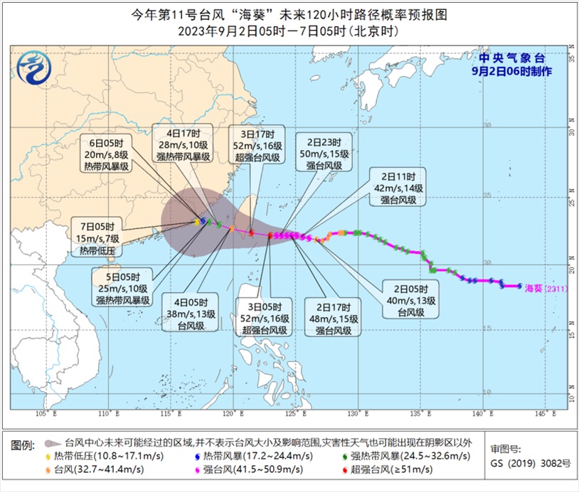 大風(fēng)預(yù)報(bào):9月2日08時(shí)至3日08時(shí),受“蘇拉”影響,南海西北部、北部灣東部、瓊州海峽及廣東沿海、廣西南部沿海、珠江口以及香港和澳門等地將有7-9級(jí)、陣風(fēng)10-11級(jí)的大風(fēng),“蘇拉”中心經(jīng)過(guò)的附近海面或地區(qū)風(fēng)力有12-13級(jí)、陣風(fēng)14-15級(jí);受“??庇绊懀?/span>臺(tái)灣海峽、浙江南部沿海、福建沿海、廣東東部沿海、臺(tái)灣島沿海將有6-7級(jí),陣風(fēng)8級(jí)大風(fēng),臺(tái)灣以東洋面部分海域風(fēng)力可達(dá)8-10級(jí),陣風(fēng)11-12級(jí),“??敝行慕?jīng)過(guò)的附近海面風(fēng)力可達(dá)12-13級(jí),陣風(fēng)14級(jí)。