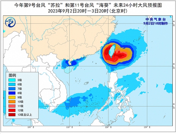 大風(fēng)預(yù)報:9月2日20時至3日20時,受“蘇拉”影響,廣東中西部沿海、廣西南部沿海、海南島北部沿海、珠江口及澳門等地將有6-7級大風(fēng),南海西北部、北部灣東部和瓊州海峽將有8級、陣風(fēng)9-10級的大風(fēng);受“??庇绊懀褪亢{南部、臺灣海峽西部、東海南部及釣魚島附近海域、浙江南部沿海、福建中北部沿海、臺灣島沿海將有6-8級、陣風(fēng)9-10級大風(fēng),巴士海峽北部、臺灣海峽東部、臺灣以東洋面及臺灣島南部沿海的風(fēng)力有9-12級,陣風(fēng)13-14級,“海葵”中心經(jīng)過的附近海面或地區(qū)的風(fēng)力有13-16級,陣風(fēng)17級。